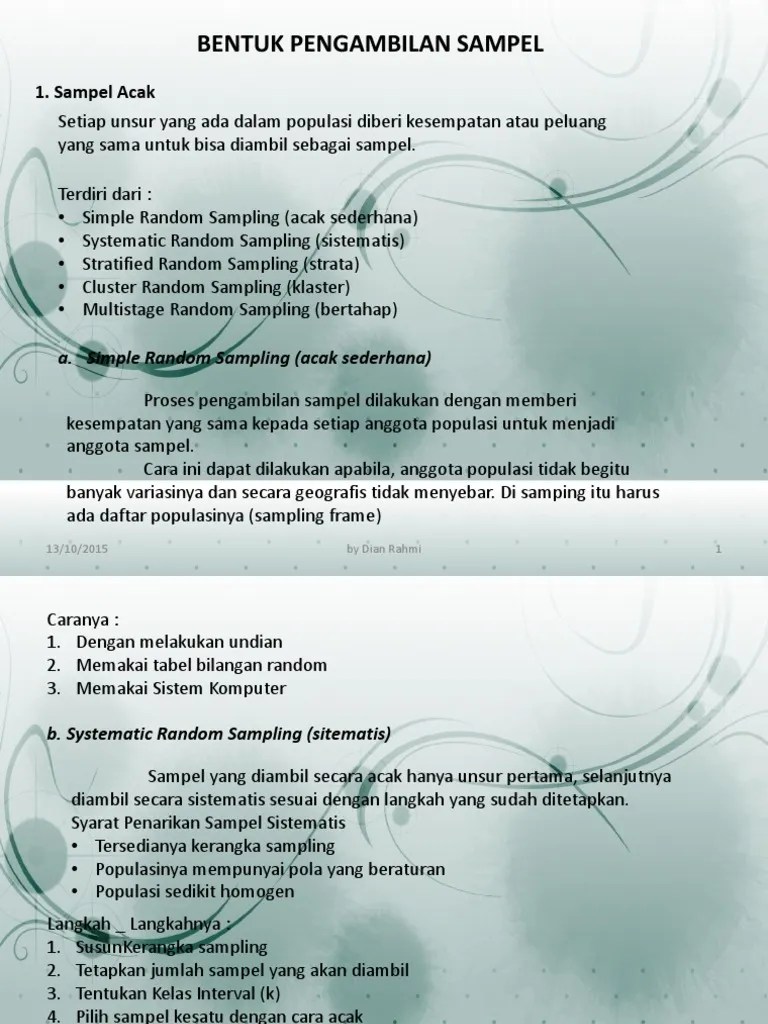 Contoh sampling kuota, akan melakukan penelitian tentangkaries gigi,. Sebuah populasi terdiri atas 500 pedagang kaki lima,. Probability sampling meliputi simple random sampling, systematic random sampling, stratified random sampling, cluster sampling, multistage sampling, . Nama tersebut termasuk di antaranya: 2) proportionale stratifiled random sampling (populasi tidak homogen).